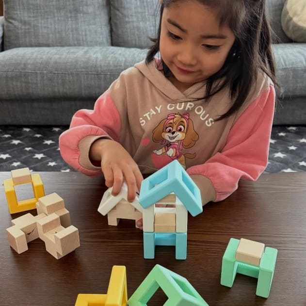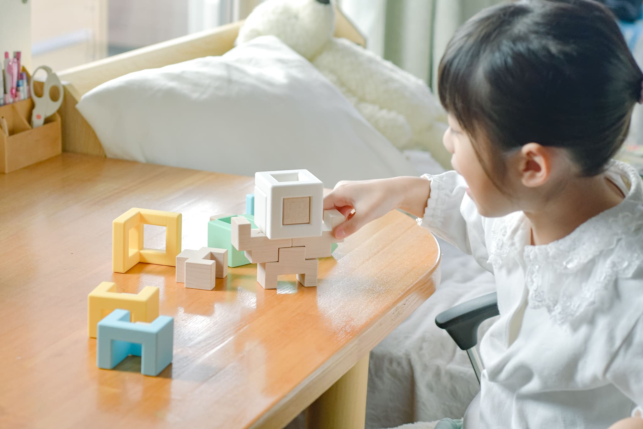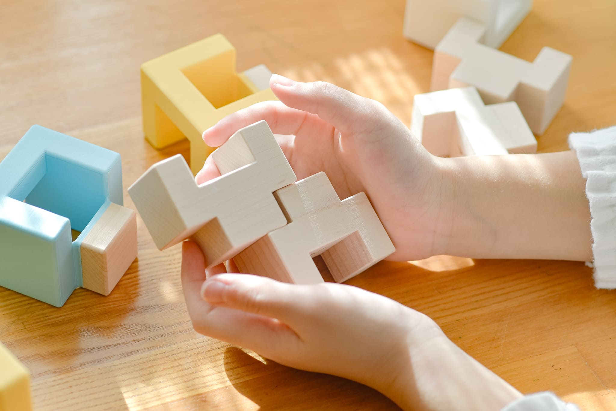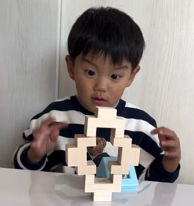 「kicoのかくれんぼ」は難解な立体パズルの特許第6962645号を3個のパーツまで少なくし子供が楽しめるように考えられた「優しい積み木」です。木のぬくもり・やさしい色と手触りを感じながら無限の創造性の展開が可能となります。たくさんのお子様の立体知能発達を養うのに役立ちます。この立体パズルは、各パーツが互いに鍵状に掛かり止めして組み合わされています。そのため、単独で各パーツを引き抜くことができない非常に難しいパズルになります。